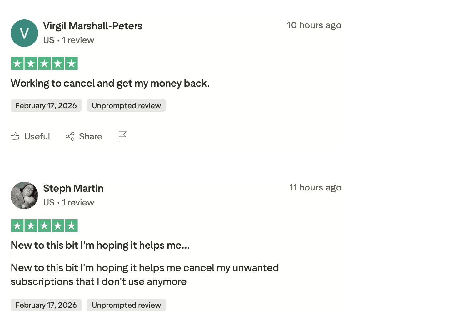 The refund-then-review pattern: Several positive reviews mention customer support by name ("Bella was exceptional") and describe getting a refund after an unexpected charge. These reviews give 5 stars for the refund experience, not the product itself. This is likely a pattern where support agents ask for a review after processing a refund, it's not outright fake, but it inflates the rating with reviews that essentially say "they charged me unexpectedly but gave me my money back."