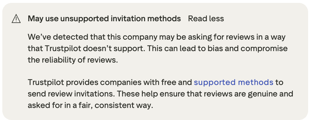 "May use unsupported invitation methods": This means Trustpilot has detected the company may be soliciting reviews in ways that violate their guidelines, such as incentivising reviews, review-gating, or using third-party services.