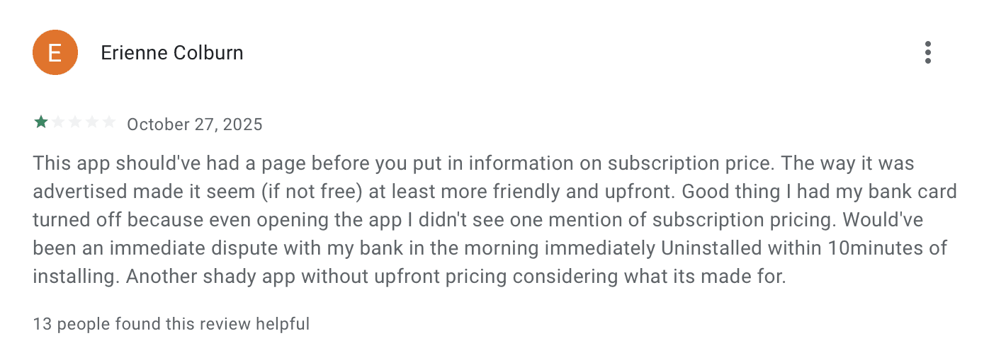 Support does mention the pricing is shown when signing up to the app, but the pattern is consistent enough that it raises legitimate concerns about how clearly the pricing is communicated during the signup flow. For an app that claims to be "built for transparency," the number of users reporting surprise charges is pretty high.